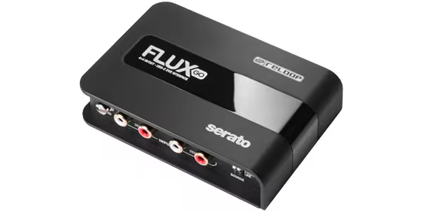 「Flux Go」は、ターンテーブルやCDJ、各種DJメディアプレーヤーをSerato DJ ProのDVS運用に組み込むための、USB-C接続・バスパワー駆動の小型インターフェースです。2チャンネル(4×4)入出力とヘッドフォン出力を備え、入力はDIPスイッチでPhono/Lineを個別に切替可能。GND端子も搭載し、現場でのDVSセットアップを最小限にまとめます。