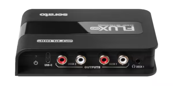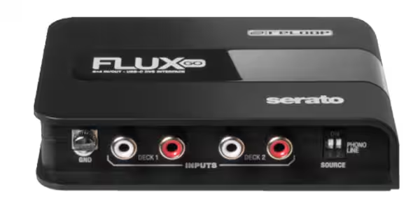 「Flux Go」は、ターンテーブルやCDJ、各種DJメディアプレーヤーをSerato DJ ProのDVS運用に組み込むための、USB-C接続・バスパワー駆動の小型インターフェースです。2チャンネル(4×4)入出力とヘッドフォン出力を備え、入力はDIPスイッチでPhono/Lineを個別に切替可能。GND端子も搭載し、現場でのDVSセットアップを最小限にまとめます。